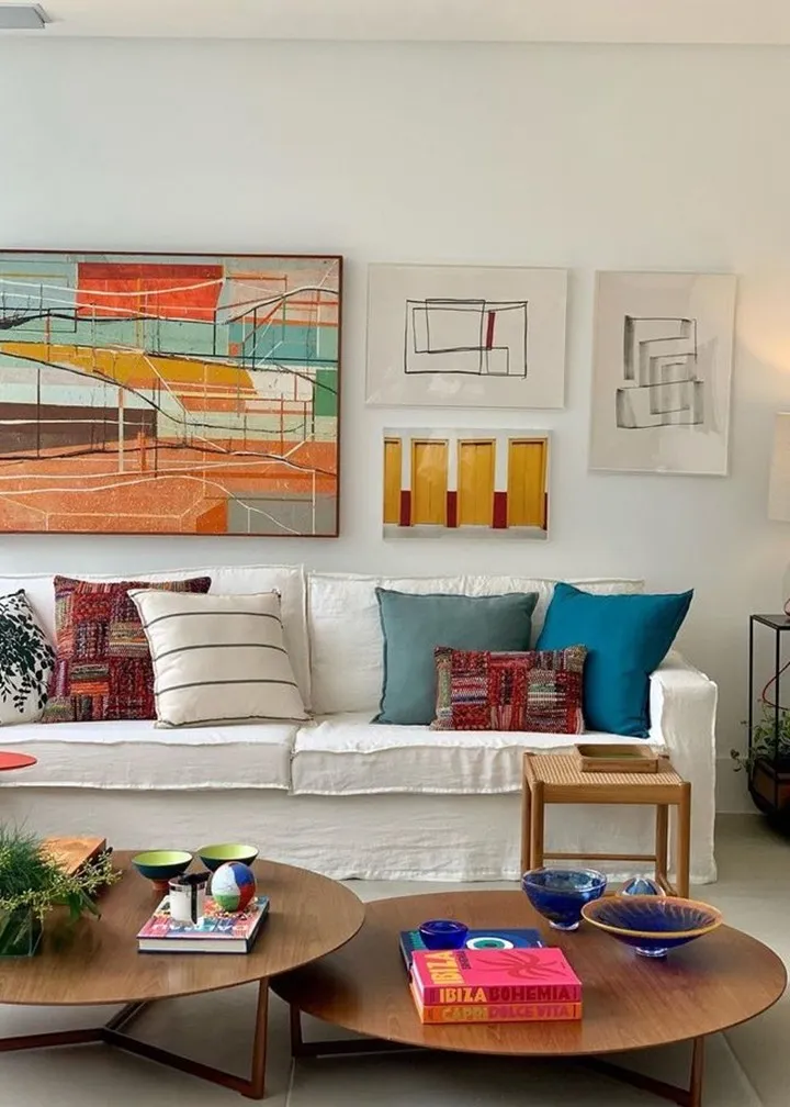 • Na decoração: paredes brancas permitem que quadros vibrantes, móveis coloridos e detalhes arquitetônicos ganhem protagonismo. Portas, janelas e rodapés podem receber cores fortes sem competir com o fundo.