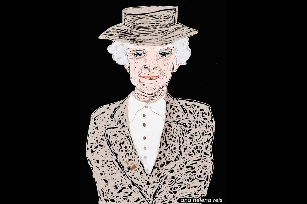 Figura icônica de Miss Marple com seu chapéu, desenhada com Apple Pencil aplicando em camadas sobre fundo preto. Ilustração por Ana Helena Reis