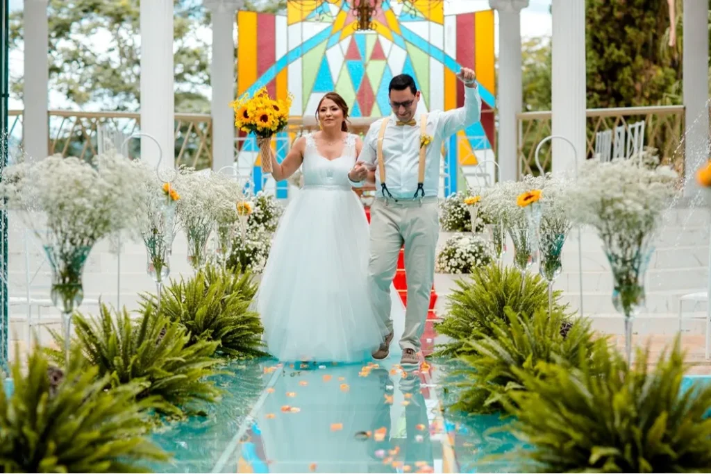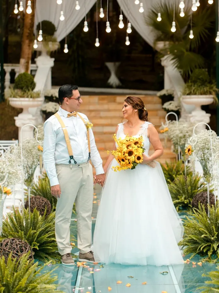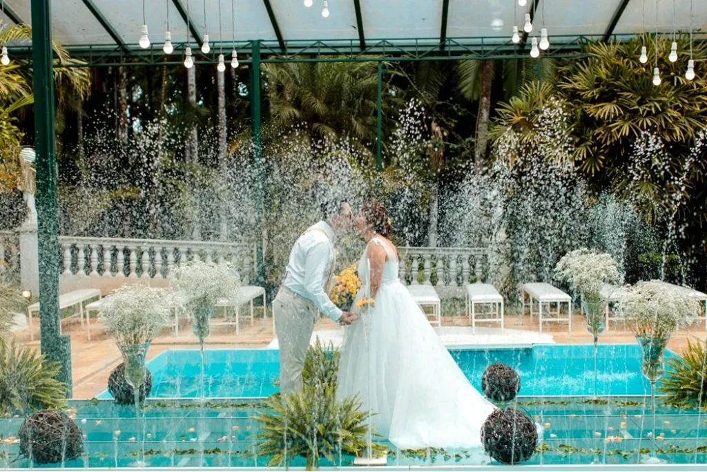 O casamento civil aconteceu em julho de 2020, lamentavelmente sem festa, devido à pandemia. A cerimônia religiosa e a celebração foram adiadas duas vezes, até que finalmente, em 30 de janeiro de 2022, o sonho se concretizou. Fizeram planos para casar no Espaço Deck, à beira da represa Billings, porém naquele dia, uma chuva impediu a cerimônia no local, mas devido aos vários espaços que o Recanto Santa Rita oferece, havia um plano B: realizar o casamento no Espaço Piscina, que acabou por resultar em momentos e fotos inesquecíveis.