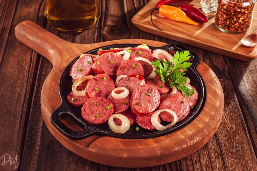 Modo de preparo: em uma panela coloque o azeite e manteiga e aqueça. Adicione a cebola roxa em rodelas e deixe murchar. Acrescente a calabresa e deixe dourar levemente. Adicione o açúcar e temperos e deixe caramelizar. Sirva com fatias de pão.