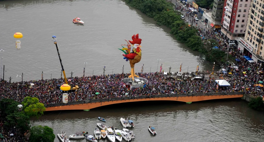 Em Pernambuco, o Galo da Madrugada e o Carnaval de Olinda revelam outra dimensão: a tradição dos bonecos gigantes, das fantasias artesanais e das referências históricas que dialogam com o frevo e o maracatu. A presença afro-brasileira é pulsante, especialmente nos maracatus-nação, onde indumentária e ancestralidade caminham juntas. As coroas, os bordados dourados e os tecidos ricos remetem à realeza negra e reafirmam identidades historicamente silenciadas.