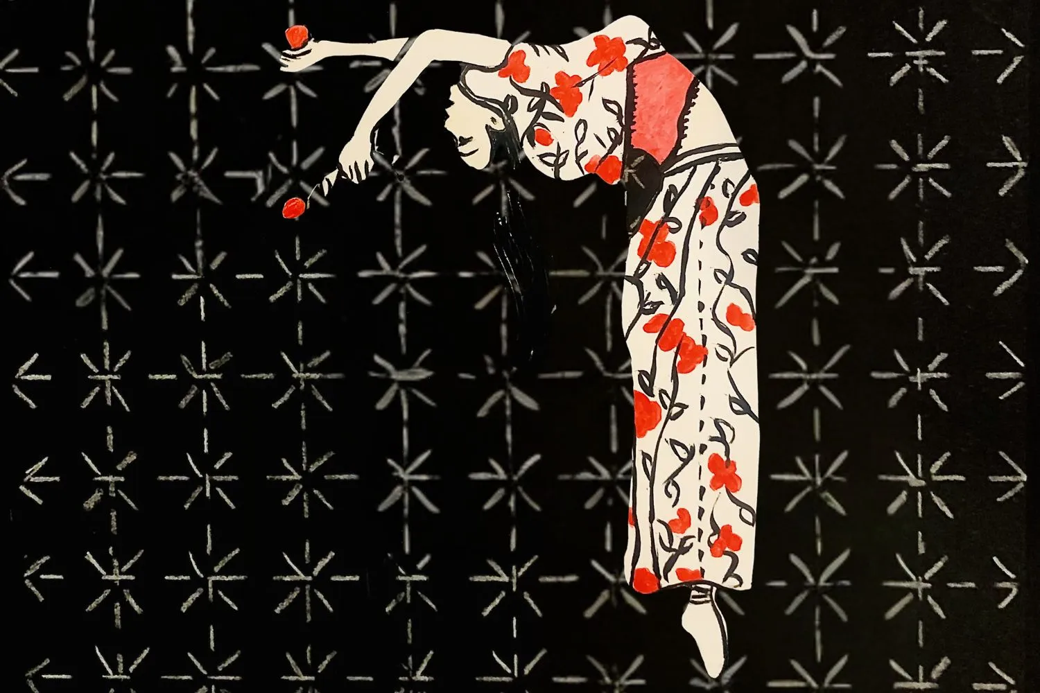 Ilustração em guache sobre desenho quadriculado Sashiko em caneta nanquim por Ana Helena Reis